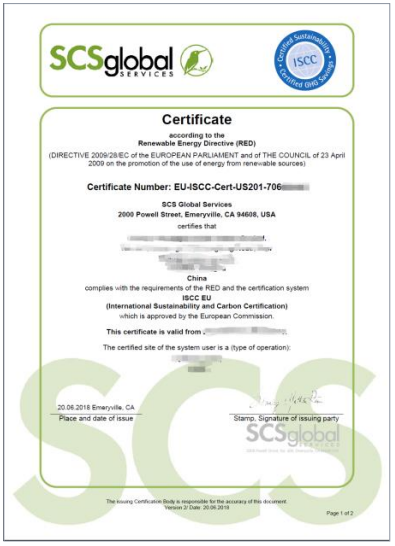 ISCC EU :是欧盟生物燃料市场内的认证体系,适用于进入欧盟的生物能源,各种类型的农业和林业原料、废物和残渣、沼气和藻类。